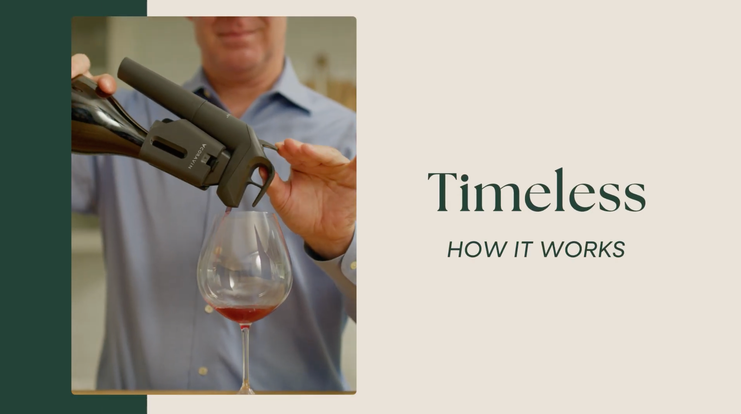 Um die beste Leistung zu gewährleisten, drücken Sie den Auslöser länger als gewöhnlich, damit der Wein schnell aus allen Löchern des Siebs fließt. Timeless Belüfter.